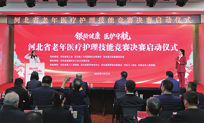 11月27日,2025年河北省老年医疗护理技能竞赛决赛启动仪式在省第八人民医院举行。本次大赛以“银龄健康 医护守航”为主题,由省总工会、省人力资源和社会保障厅、省卫生健康委联合主办。省总工会党组书记、常务副主席齐为民,省卫生健康委党组书记、主任姜建明,省人力资源和社会保障厅、省委省直机关工委有关领导出席启动仪式。