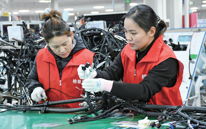 1月5日,邯郸永旭汽车电子有限公司工人正在汽车线束生产线上加紧赶制订单产品。元旦过后,我省各地企业纷纷开足马力,抓紧生产赶制订单,力争实现新年“开门红”。 (记者杨磊涛 通讯员胡高雷摄)