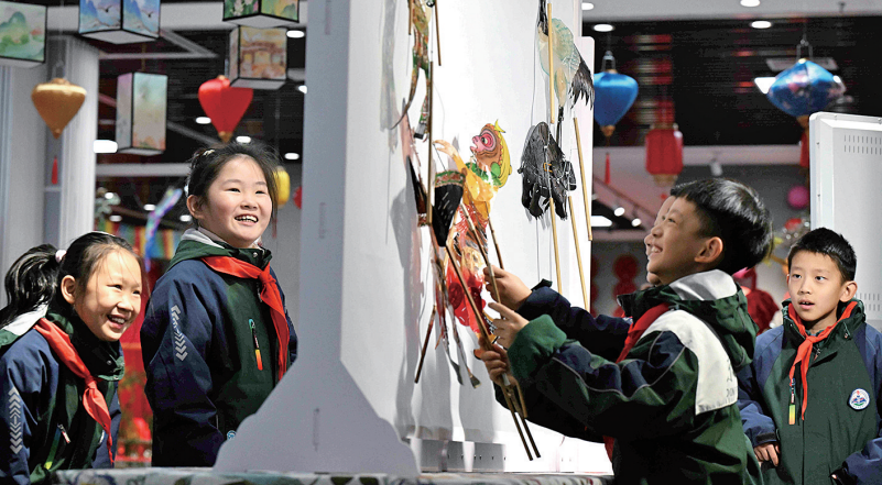1月6日,小朋友在河北省群众艺术馆“大美河北 欢乐春节”非遗主题展览互动区体验皮影戏。