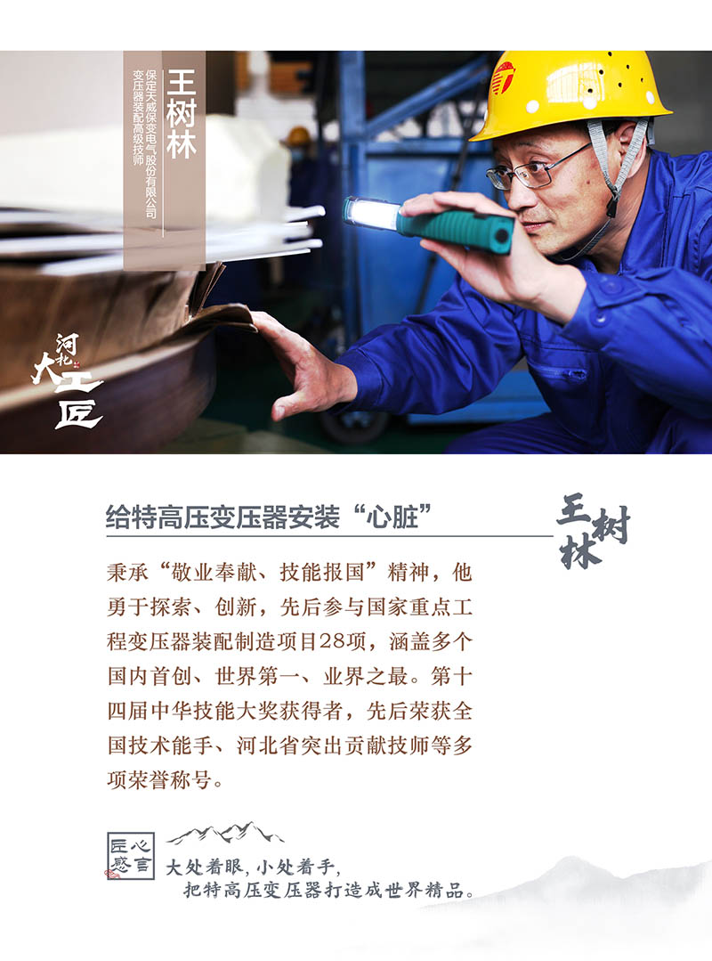从业32年来,王树林一直从事变压器制造装配工作,秉承“敬业奉献、技能报国”精神,勇于探索,善于创新,不断攻克技术难关。他常说,他的工作就像给特高压变压器安装心脏,因此所做必属精品。32年来,他作为技能骨干参与了多项高、精、尖特高压产品的装配工作,每件产品质量都响当当。