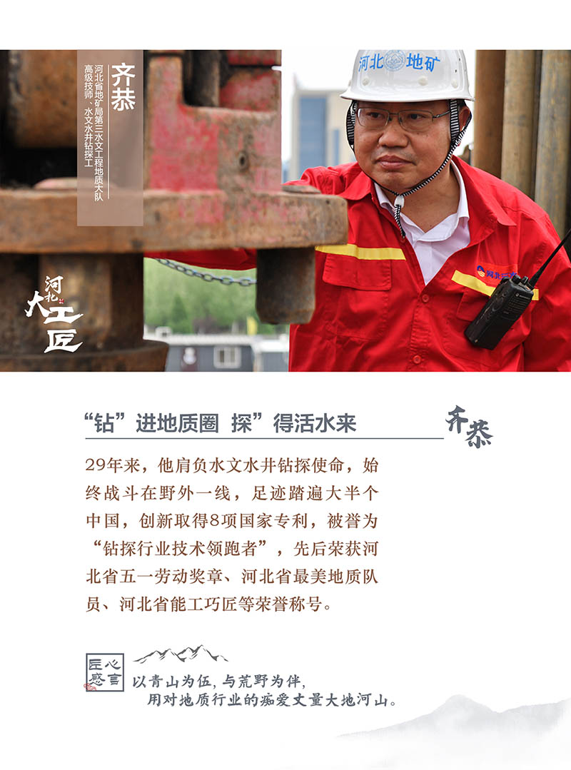 1992年,21岁的齐恭从河北省地质矿产技工学校岩心钻探专业毕业,顺利进入河北省地矿局第三水文工程地质大队成为一名钻探工。“以青山为伍,以荒野为伴,用对地质行业的痴爱丈量大地河山”齐恭走上工作岗位就坚定了自己的目标,“用努力工作创造出优秀成绩,是对社会、对家人、对自己最好的回报”。