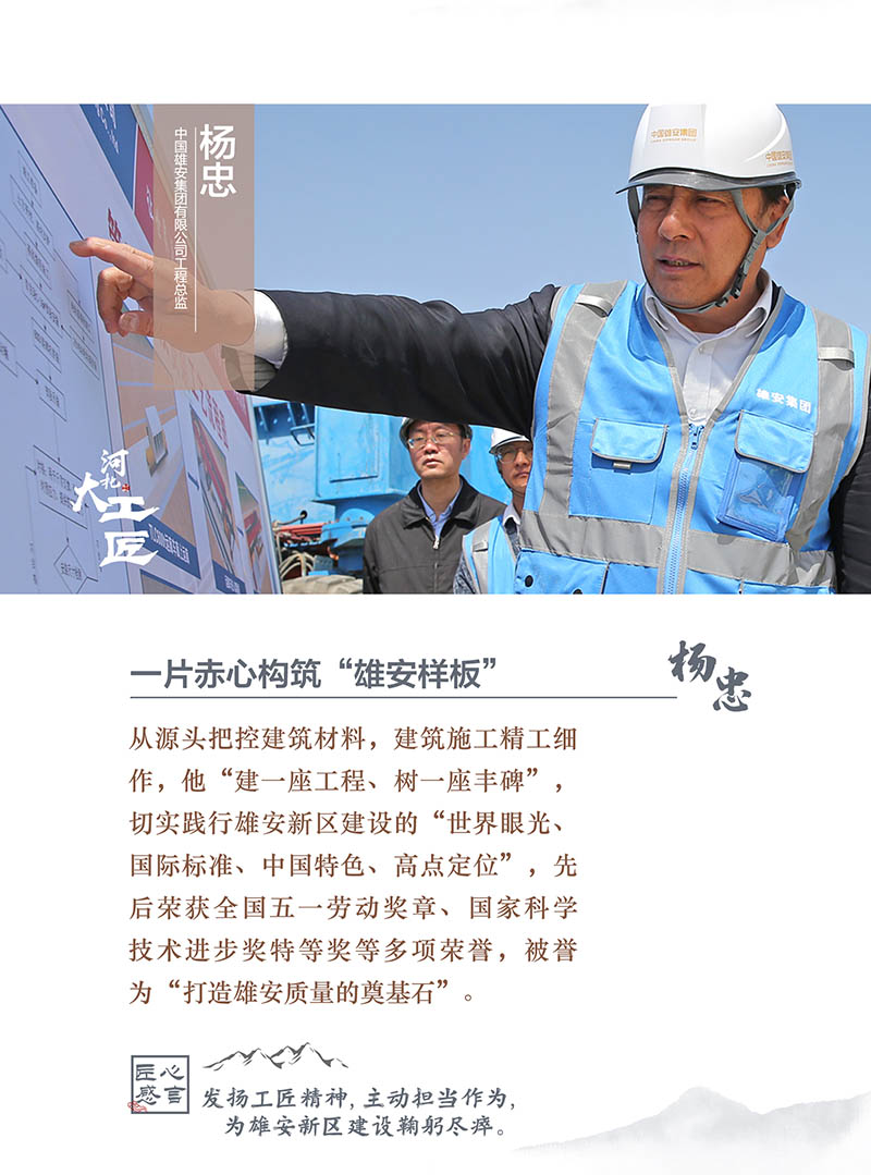 根据雄安新区规划的建设规模测算,新区建筑骨料总需求约4亿吨。杨忠结合自身专业知识和多年丰富工作经验,积极谋划推动南水北调中线雄安调蓄库项目。该项目位于保定市徐水区,蓄水总量达2.55亿立方米,建成后将有力保障雄安新区供水安全。同时,将水库开挖产生的4亿吨弃渣回收利用,每年能够提供超过2000万吨的高品质砂石骨料,可满足雄安新区70%以上的砂石骨料需求。他创造性地把水库开挖、抽水蓄能电站、弃渣综合利用三者结合起来,打造成为雄安“水之源”、江水“净化器”、供电“能源站”、雄安“骨料仓”、绿色发展新引擎,该项目成为雄安新区建设带动周边同步发展,实现资源共享和环境同步提升,践行新发展理念的示范项目。