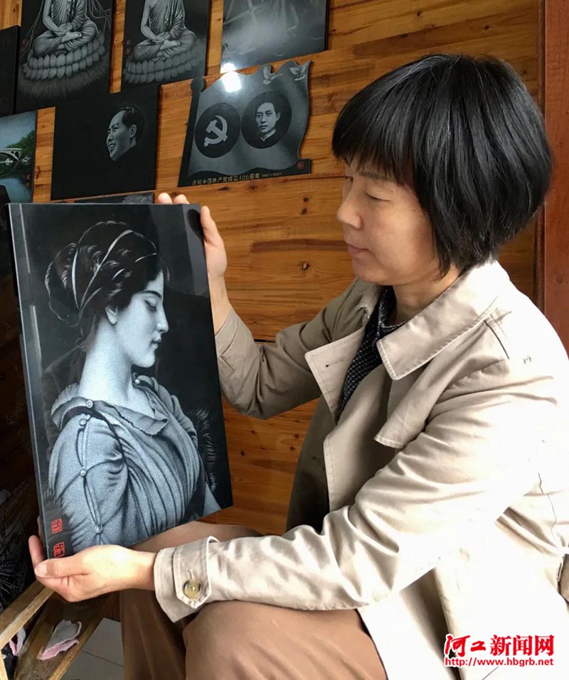 完全静下心来的方士英,在创作上一发不可收拾。在南北石雕艺术精华的基础上,她大胆创新,让石影雕的手法从传统的凿刻演变成立体刻画,色彩也从传统的单色演变成彩色。2013年,吴桥石影雕技艺被列入河北省级非物质文化遗产名录,方士英成为吴桥石影雕技艺的第五代传承人。