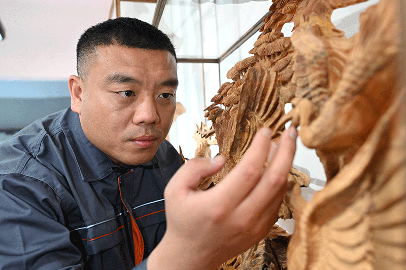 许红阳虽是“90后”,却处处透出成熟与稳重。只见他手握刻刀,神情专注地按照先前描绘好的线条凿刻手中木块。刻刀所至,木屑纷飞,一凿一刻间,原本造型怪异的木头渐渐显露出老鹰的模样。