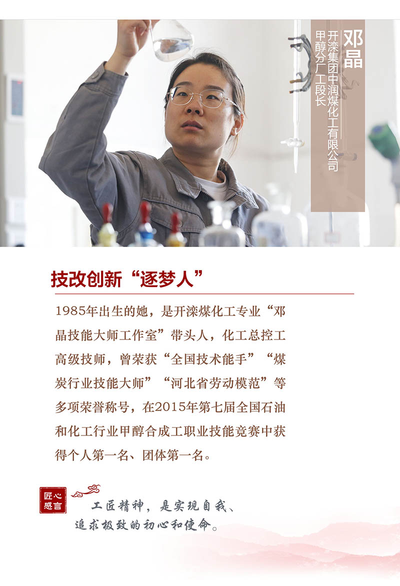 在开滦中润公司提到“邓晶”这个名字几乎无人不知无人不晓。从成功处理甲醇装置第一次突发事故、甲醇第一个学练比状元、代表开滦煤化工第一次走出集团提供技术指导,到开滦煤化工第一个国赛第一名、第一个首席技师、第一个技能大师工作室、第一个“全国五一巾帼标兵岗”……她是公司生产一线上为数不多的女性管理人员,甲醇分厂的实力担当。
