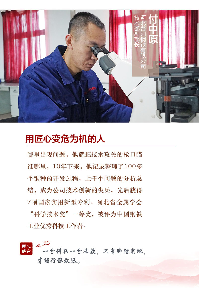 河北普阳钢铁有限公司技术部副部长,2011年参加工作。10年来,他先后获得了7项国家实用新型专利,还获得了中国钢铁工业优秀科技工作者,河北省金属学会“科学技术奖”一等奖。