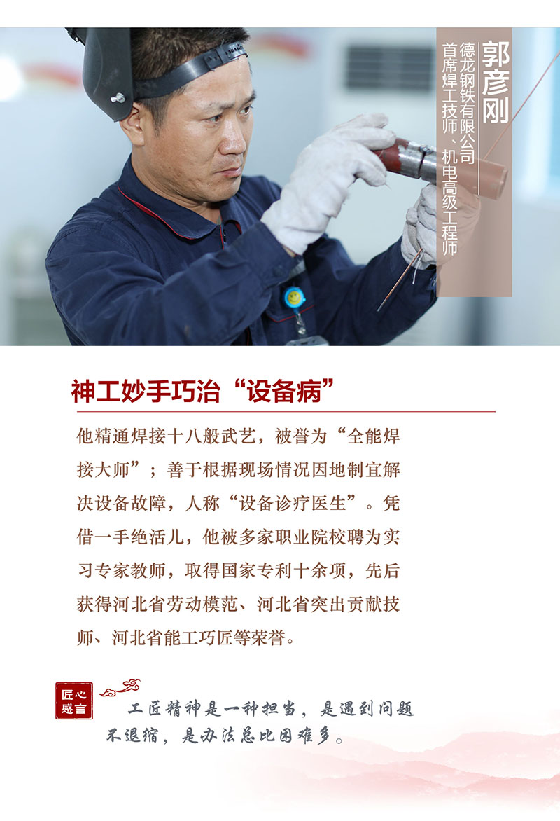 德龙钢铁有限公司首席焊工技师,他技术全面精湛,焊接十八般武艺样样精通,被誉为“全能焊接大师”,郭彦刚创新工作室取得国家专利9项、科技先进成果3项,累计完成技改创新改造699项,创效1374.35万元。