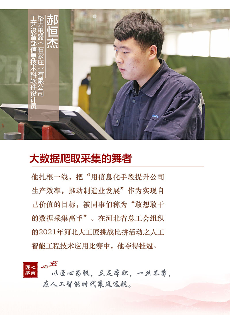 格力电器(石家庄)有限公司工艺设备部信息技术科软件设计员。自入职以来,他把“用信息化手段推动制造业发展”作为实现自己价值的目标,并为此不懈努力,被同事们称为“敢想敢干的数据采集高手”。