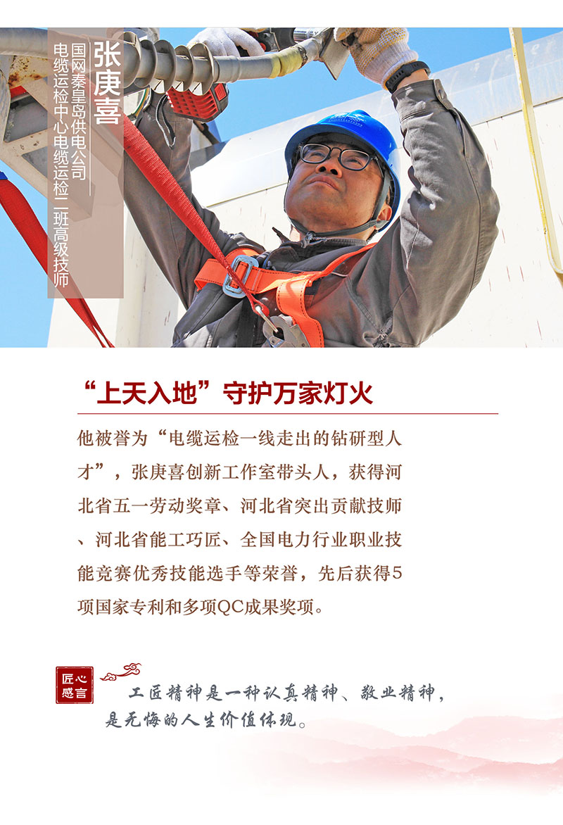 无论是寒冬酷暑,还是风霜雨雪,参加工作28年来,他始终奋战在电缆运检一线。从一名小学徒到技术员,再到高级技师,他用火一样的热情和辛勤劳动,在工作岗位上实现了自我人生价值。这个人就是国网秦皇岛供电公司电缆运检中心电缆运检二班高级技师张庚喜。